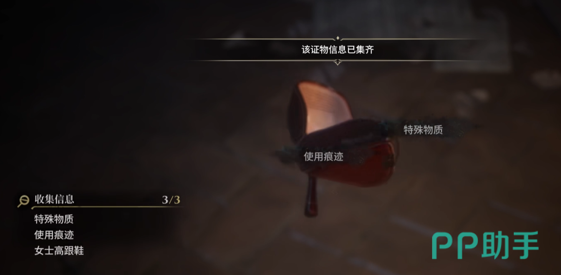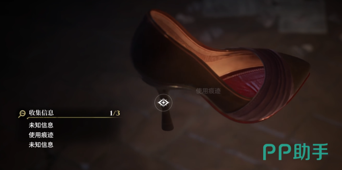 靠近之后,就能进行细致地观察。然后发现有过使用痕迹,真的是一个保养得很好的真皮高跟鞋。不过仔细观察后,也在上面发现了未名物资,收下之后,这件高跟鞋就会回到线索板上面。大家可以搭配其他线索一起使用,即可发现真相。