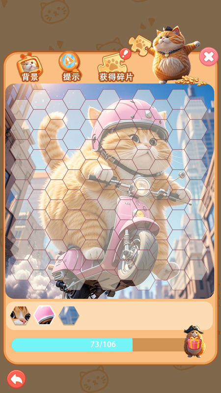 沿用经典九宫格、十六宫格等标准拼图结构,所有碎片均绑定独立骨骼动画。当玩家正确归位任一图块,相邻区域的猫咪角色即触发微交互:摇尾、眨眼或轻跃。全关卡通关后,可激活“舞蹈编排”功能,自定义3只猫咪的动作序列并生成短视频。整体美术风格采用低饱和度柔光渲染,视觉压力小,适合长时间休闲游玩。