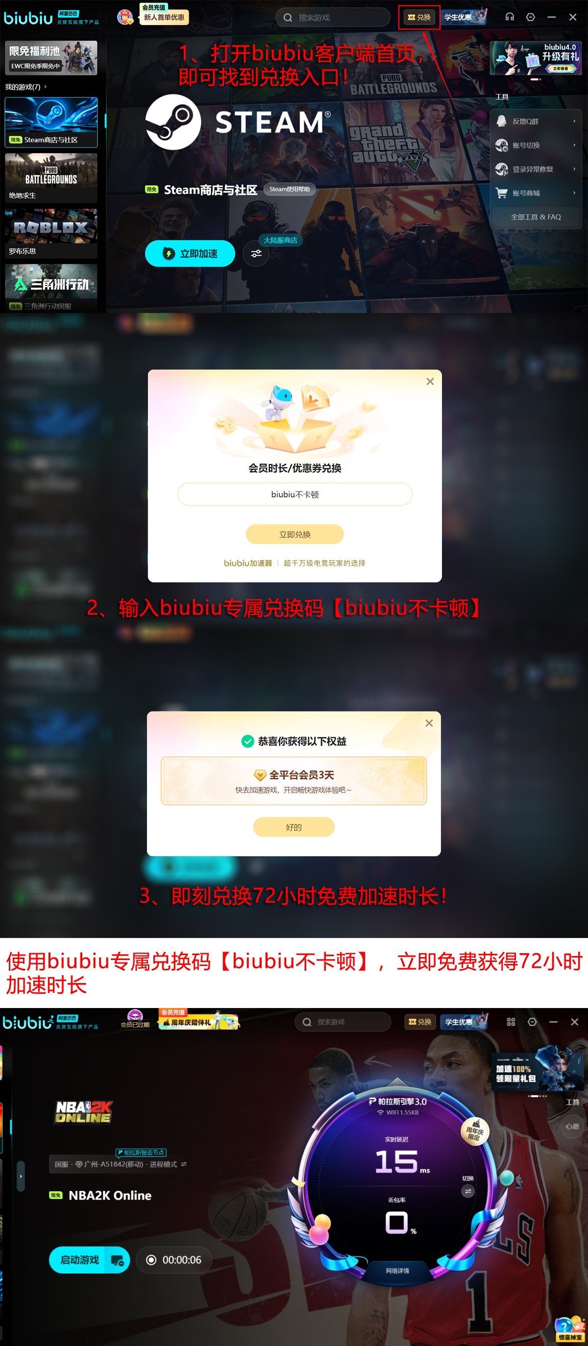 新用户首次登录biubiu加速器,即可获赠24小时全功能试用权限,真实体验低延迟环境下的流畅对战。所有用户(含老用户)均可在首页输入专属口令【biubiu不卡顿】,额外领取72小时加速时长,进一步提升使用灵活性与性价比。