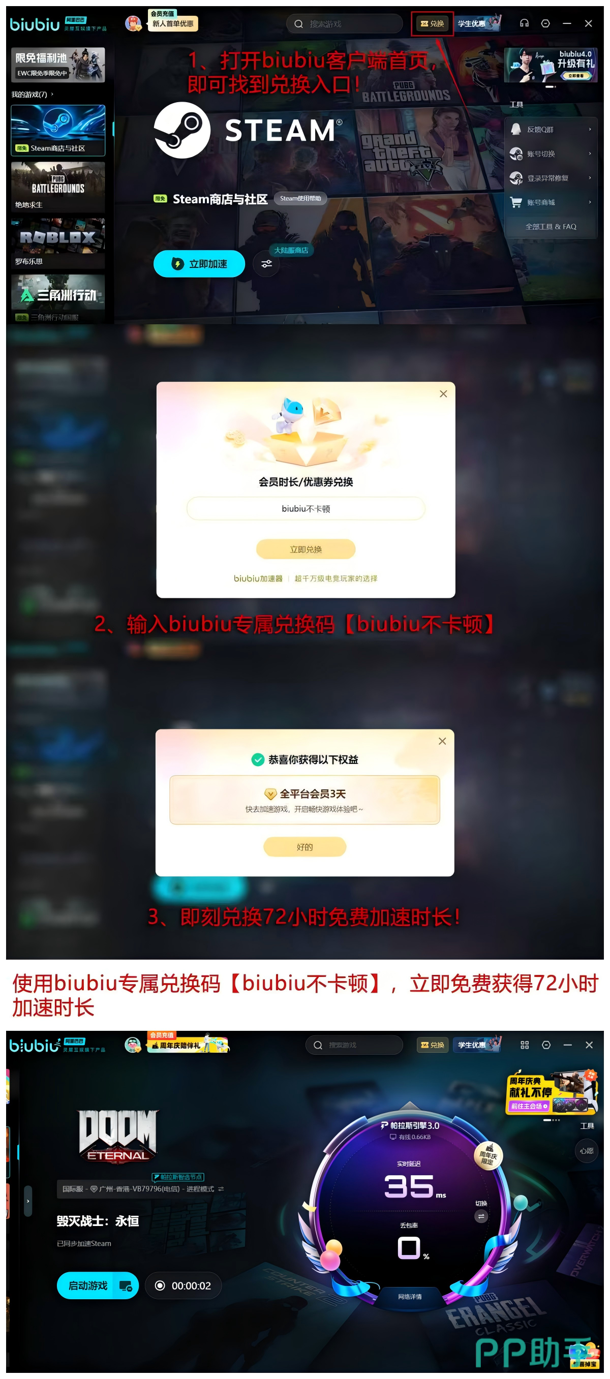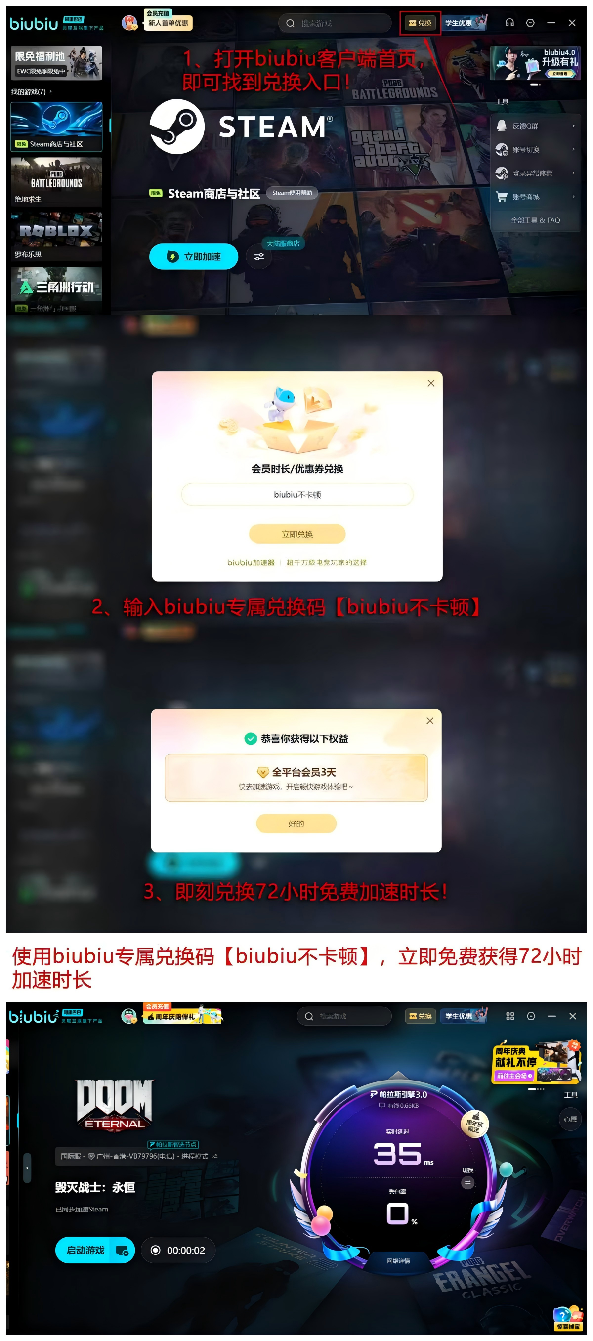 【biubiu不卡顿】可在活动页面兑换72小时加速时长,叠加新用户首赠24小时,总计达96小时体验周期,远超同类付费加速服务的标准时长配置。