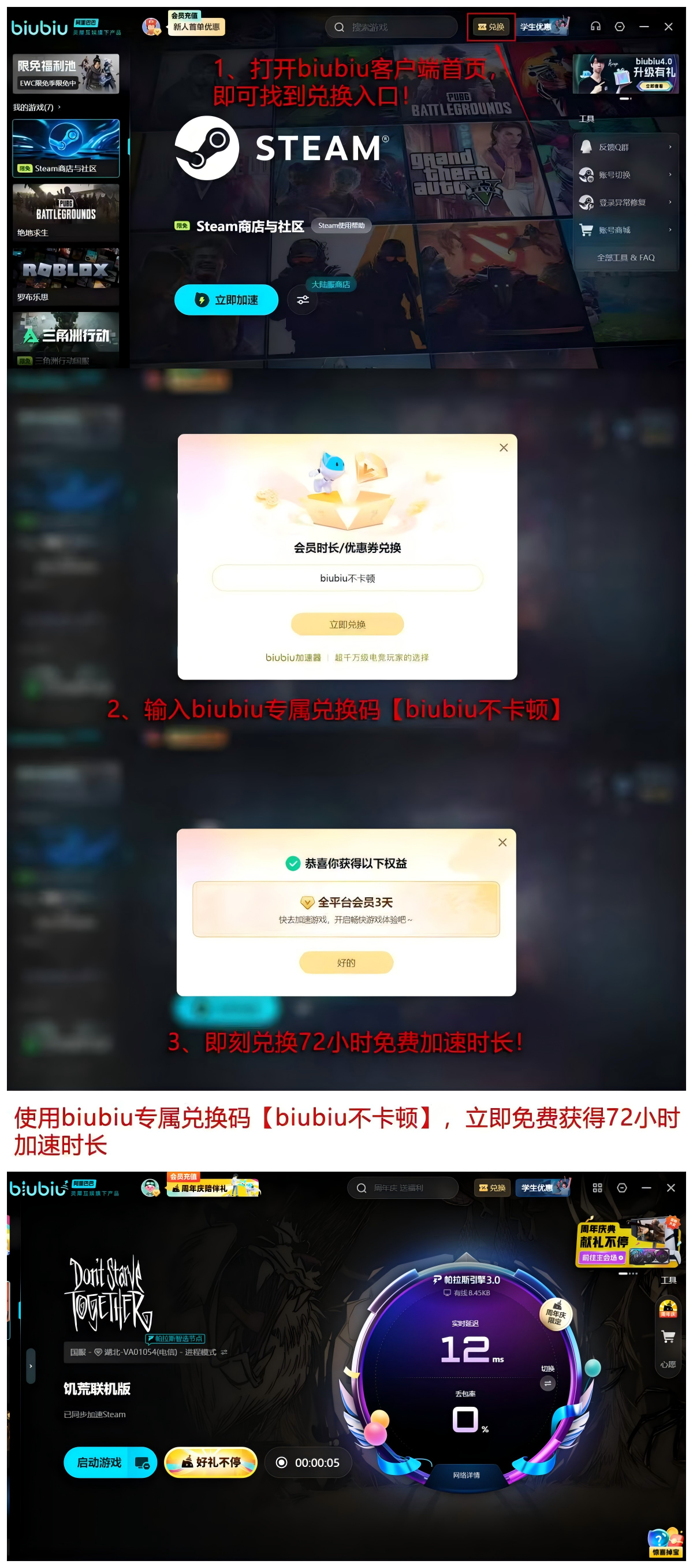输入专属激活码【biubiu不卡顿】,即可立即获得72小时连续加速权益;新注册用户还将自动叠加24小时新手体验时长,总计达96小时,充分满足长周期联机需求。对于高频参与合作生存的玩家而言,这是保障会话连续性与操作响应精度的有效手段。