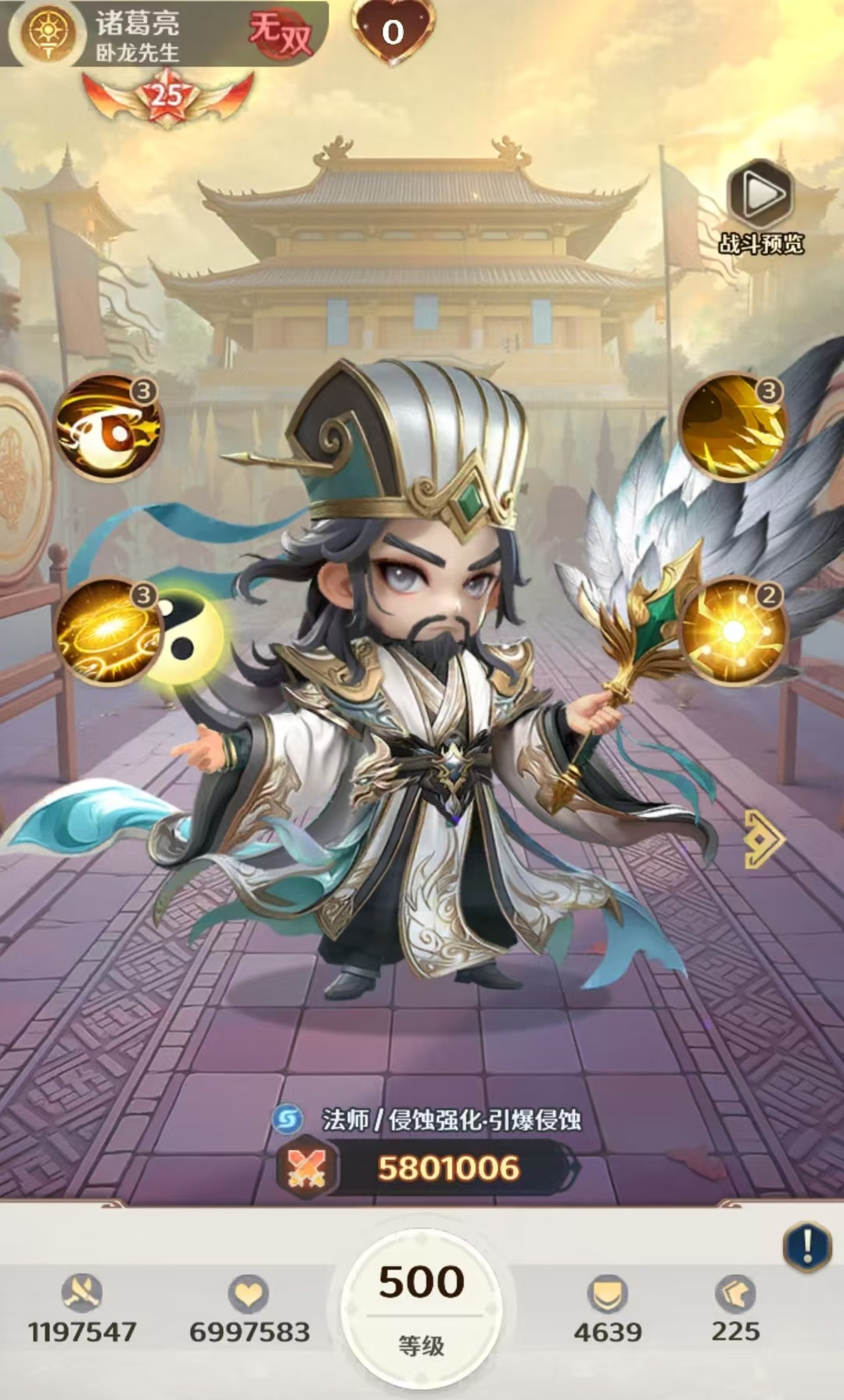 排名第二的是无双曹操,无双曹操也是现在很多阵容搭配过程中的主c,大招具有超高的物理伤害效果,并且会根据敌方身上的负面层数提升伤害倍率。曹操只要和一些能够附加负面状态的队友一起配合起来,场上的输出也非常可观。另外大招还具有偷暴击和偷暴击率的效果,战斗到后期伤害输出更恐怖。曹操的被动可以通过攻击恢复生命值,受到伤害有几率偷取抗爆,既提升了自身能力,又削弱了对方。排名第三的是无双诸葛亮,无双诸葛亮作为群体输出型法师,他的大招可以对全体造成法术伤害,并将目标身上的混沌侵蚀全都触发起来引爆。在被动的加持下,触发混沌侵蚀时还可以给对方最低的目标恢复生命值。这样既有爆发能力,又有一定的团队治疗能力。