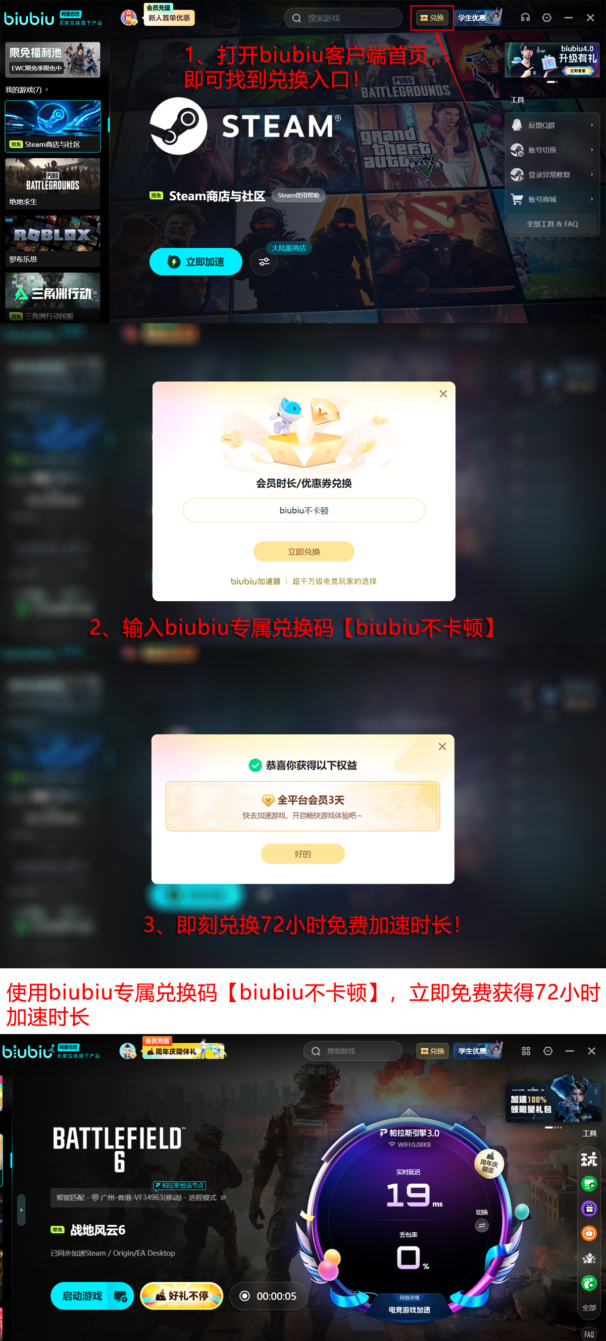新用户可立即启用新人福利,获取24H的免费加速权限,直观感受连接质量提升效果。如需延长体验周期,每个账号支持输入兑换码【biubiu不卡顿】,即可额外领取一次三天免费加速服务。叠加首赠时长,实际可享总计96小时无限制加速权益。