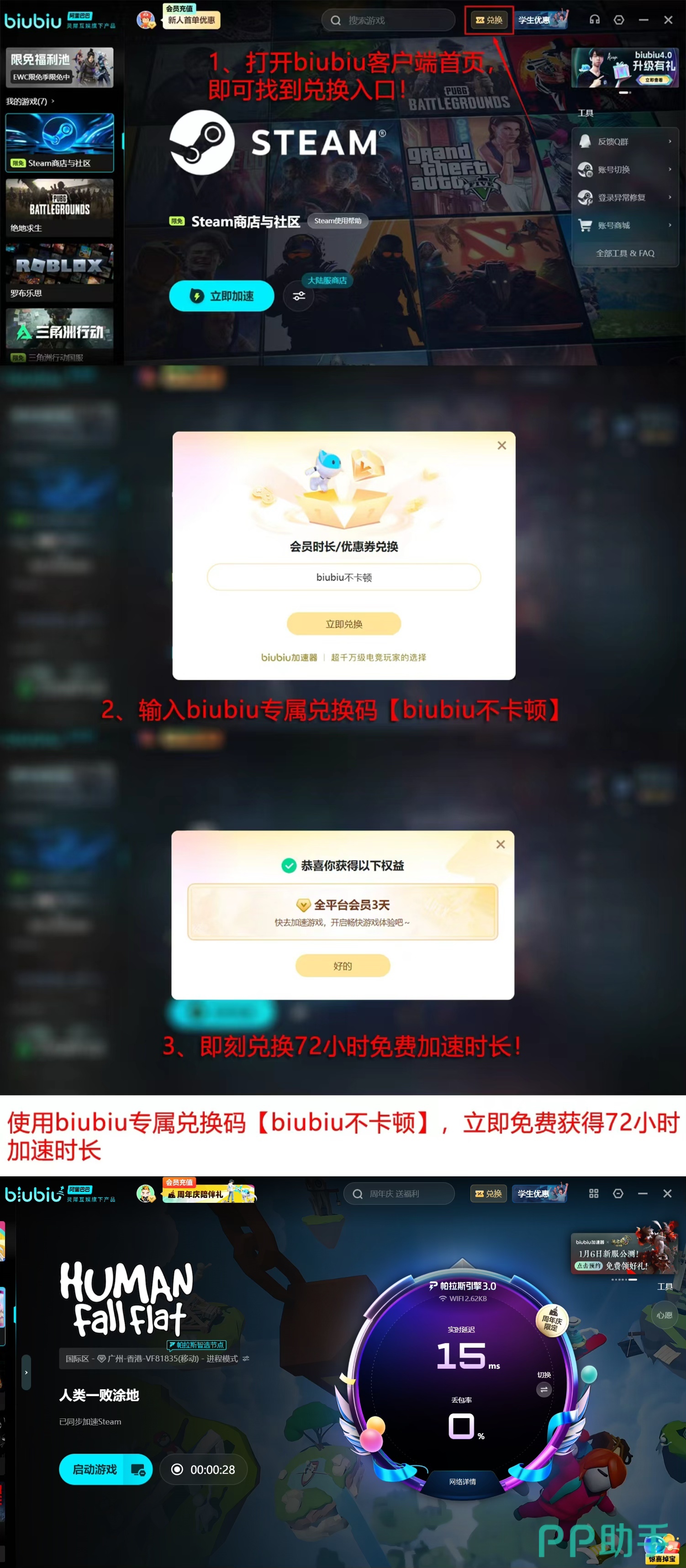 当前平台面向全体玩家发放专属福利:限时开放一批兑换码【biubiu不卡顿】。所有用户——无论新老——在biubiu客户端内输入该代码,即可立即获得72小时全游戏节点免费加速权限。针对新注册用户,系统还将额外赠送24小时基础试用时长,累计可享长达96小时(即4天)的完整体验周期,充分验证其在多地图、多模式下的延迟压制效果与连接稳定性。