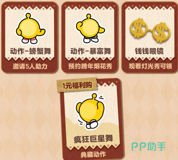 同时本次活动还可以获取到特殊动作和装饰。螃蟹舞的话只需要玩家们邀请5人来进行助力便可以获取到。动作暴富舞则是需要玩家们预约跨年烟花秀便可以获取。装饰钱钱眼镜则是可以观看灯光秀可以领取,最终的疯狂巨星舞则是需要花费1元来进行购买获取到。