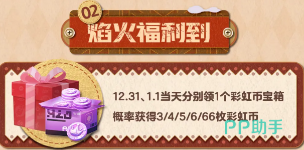 在活动开启后,咱们的蛋仔们还可以领取到焰火福利,我们可以在31号和1号的时候分别领一个彩虹币的宝箱。这个宝箱在打开后可以获取到部分的彩虹币,这里面有概率可以获取3,4,5,6和66枚的彩虹币,至于具体可以开多少,那都是和自身运气有关。