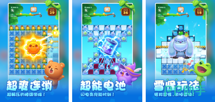 这是一款以动物形象为主题的三消类益智游戏,包含青蛙、小熊、狐狸等Q版角色。玩家只需滑动屏幕,将三个及以上相同图标连成一线即可消除,规则简洁易懂。游戏已累计上线超一万关卡,每关目标明确(如收集指定数量动物、清除冰块或果冻等),道具系统直观易用。背景音乐轻松明快,音效清脆柔和,配合好友互助送体力机制,在保持趣味性的同时避免了高强度竞争感。