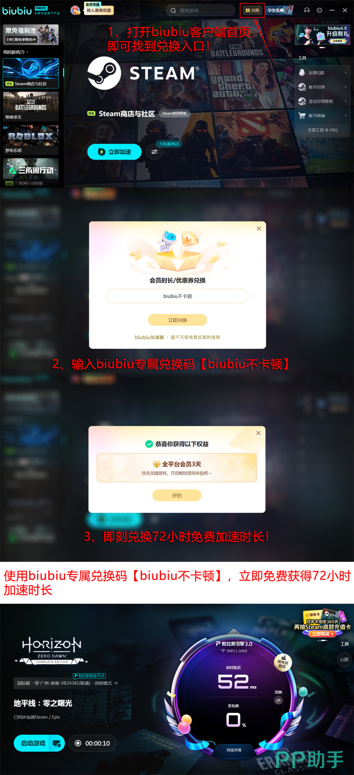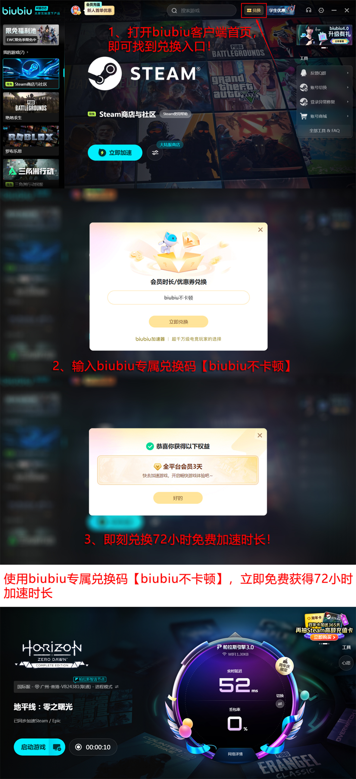 新用户注册即享24小时免费加速权益,无需绑定支付方式即可立即启用。此外,平台长期开放专属兑换通道:输入激活码【biubiu不卡顿】,每个账号可额外领取72小时高级会员时长。叠加使用后,总计96小时的连续加速服务足以覆盖完整的新手适应期与核心内容体验周期。