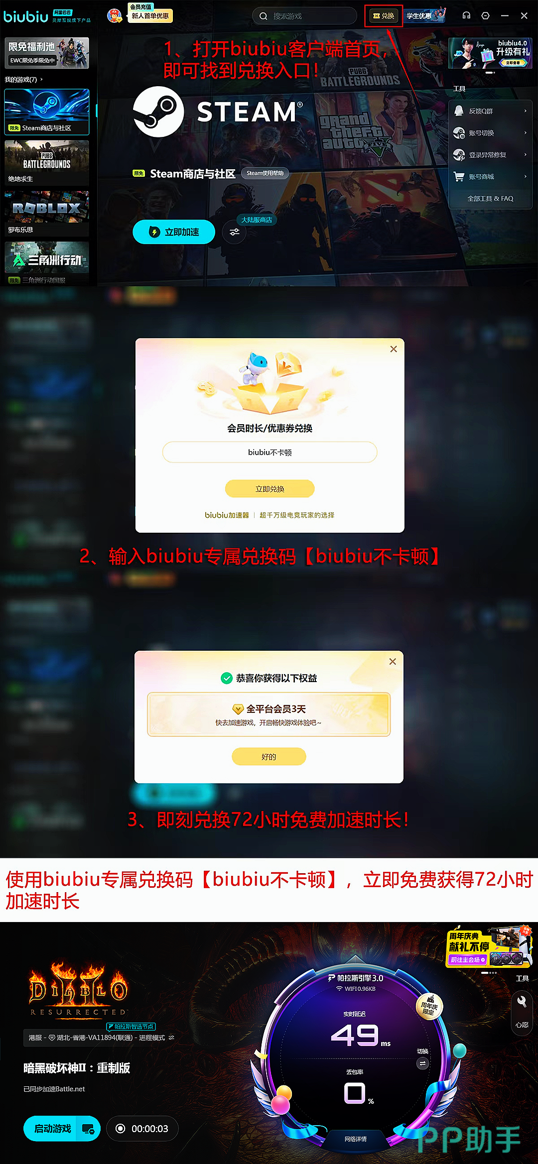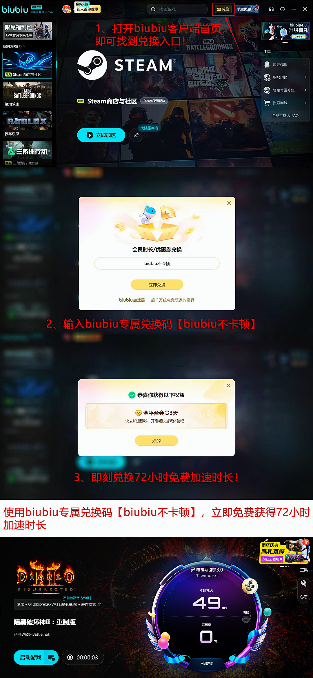用户反馈显示,biubiu在兼容性与服务响应方面具备明显优势,支持包括《暗黑破坏神2》在内的数百款老游戏与现代网游。新注册用户可立即领取24小时全游戏通用加速时长,期间不限次数切换加速目标;此外,输入专属兑换码【biubiu不卡顿】,无论新老用户均可额外获得3天高级功能使用权,涵盖DNS智能解析、UDP穿透强化及多节点自动优选等核心能力。