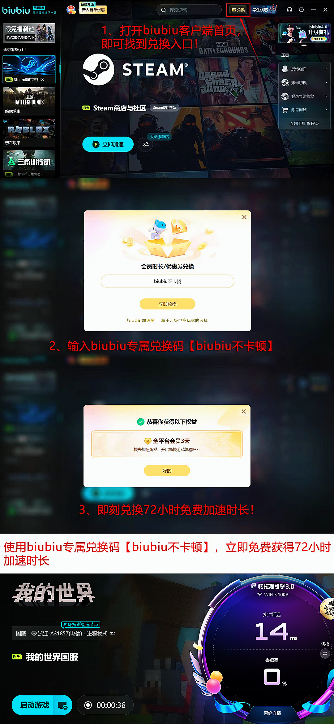 平台持续推出用户激励政策:新注册用户可即时领取24小时全游戏通用加速时长;所有用户(含老用户)输入兑换码【biubiu不卡顿】,即可激活额外3天高级服务权限,覆盖《我的世界》全版本及海外服联机需求。
