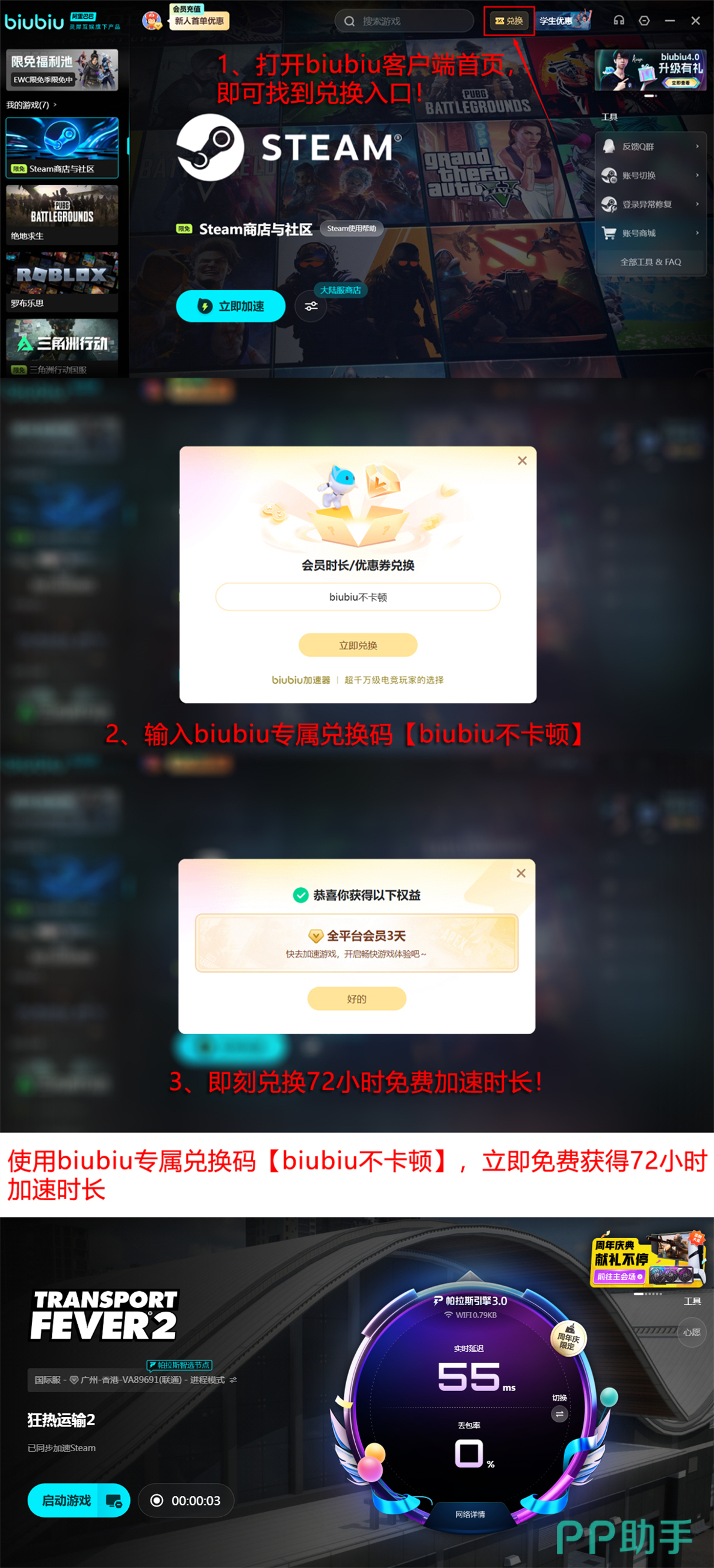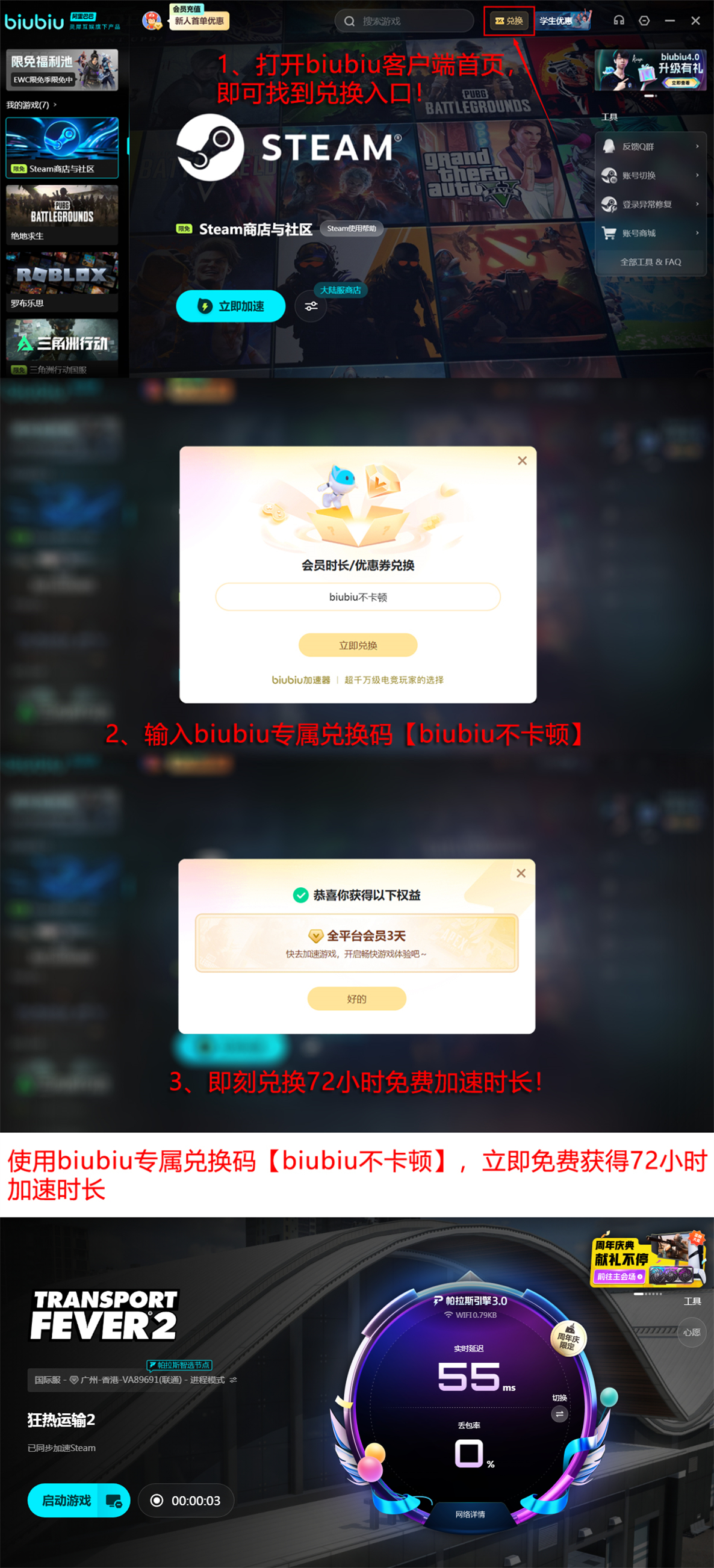 在服务机制上,biubiu采用会员订阅制,新注册用户可直接领取24小时全功能免费试用权限,无需预充值即可完成效果评估。此外,平台统一发放通用型兑换码【biubiu不卡顿】,所有账号均可使用一次,兑换后获得72小时连续加速时长。两项权益叠加,新用户最高可累计获取96小时无限制加速服务,覆盖完整调试周期与深度体验阶段。