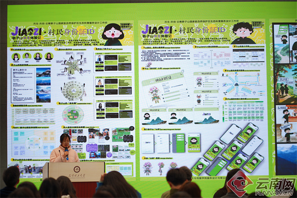 成果汇报现场,12个小组逐一展示成果方案。“村民身份证”小组以“村民证”为核心,打造串联全流程的“奇遇钥匙”以情感化机制强化游客与保护区的联结,提升保护认同;“秘境寻踪:轿子山生态弈局”小组,让游客化身“生态建筑师”,在海拔闯关途中学习生态知识;“生态侦探”小组,以设计沉浸式研学路线为主线,引导参与者在探索中学习生态保护知识;“云顶轿茶”小组通过垃圾兑换一杯好茶方式,还轿子山一片洁净;Z世代文艺青年们融合数字技术与在地文化,打造虚拟乐队IP,唱响“圣山摇滚音乐节”,拓宽生态文化传播形式;亦有团队从行为激励出发,构建“蓝天垃圾银行”服务系统,助力生态保护成为游客行为习惯。