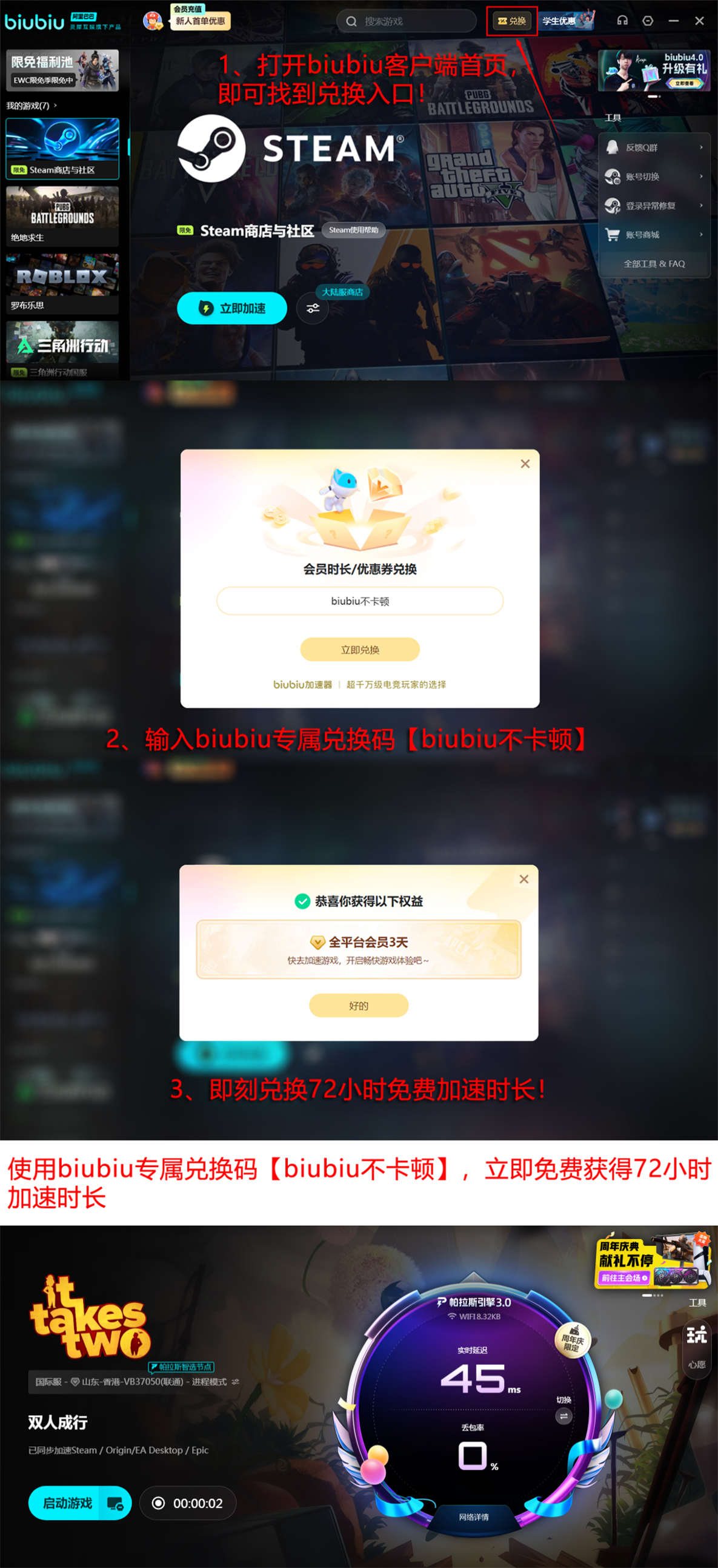 会员服务支持灵活计费模式,含月付、年付等多种周期选项。新用户注册后可享24小时免费加速体验,用于实际测试网络优化效果。另设专属福利通道:输入兑换码【biubiu不卡顿】可领取72小时加速时长,限每个账号使用一次。