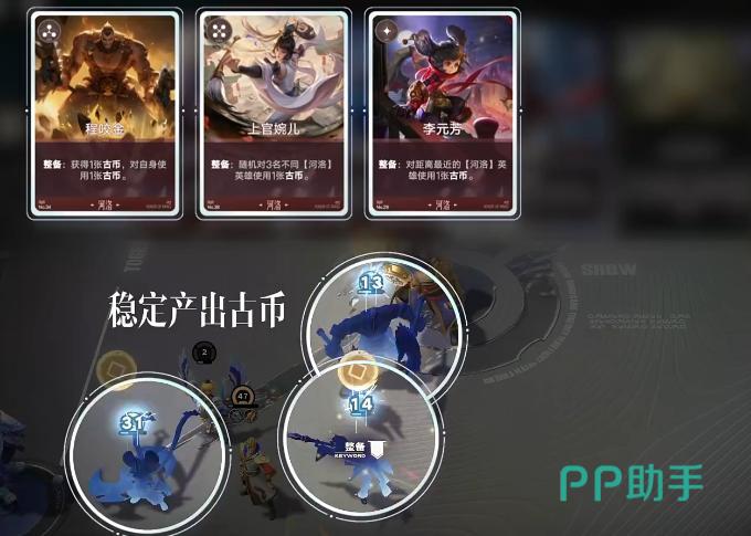 差不多是7个回合上下,血量健康、棋手等级到4级,再补婉儿、李白, 前者在中期给许多英雄升级,后者则是强化古币升级效果,自身也有不错战力。这样阵容基本完善后,8-9回合棋手等级升到5级,搜到武则天,补齐古币最后的强化链条。