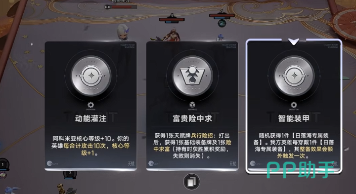 这个阵容的玩法主要是度过中期,一般在前期的话会选择姬小满以及亚瑟过度,这两个英雄其实是不太吃属性等级的,在提升的过程中,卡牌方面要尽可能选择带有日落海词条的buff牌,推荐选择智能装甲这个buff,该buff 的作用就是穿戴一件防御装备,可以抵御对面的连环攻击。