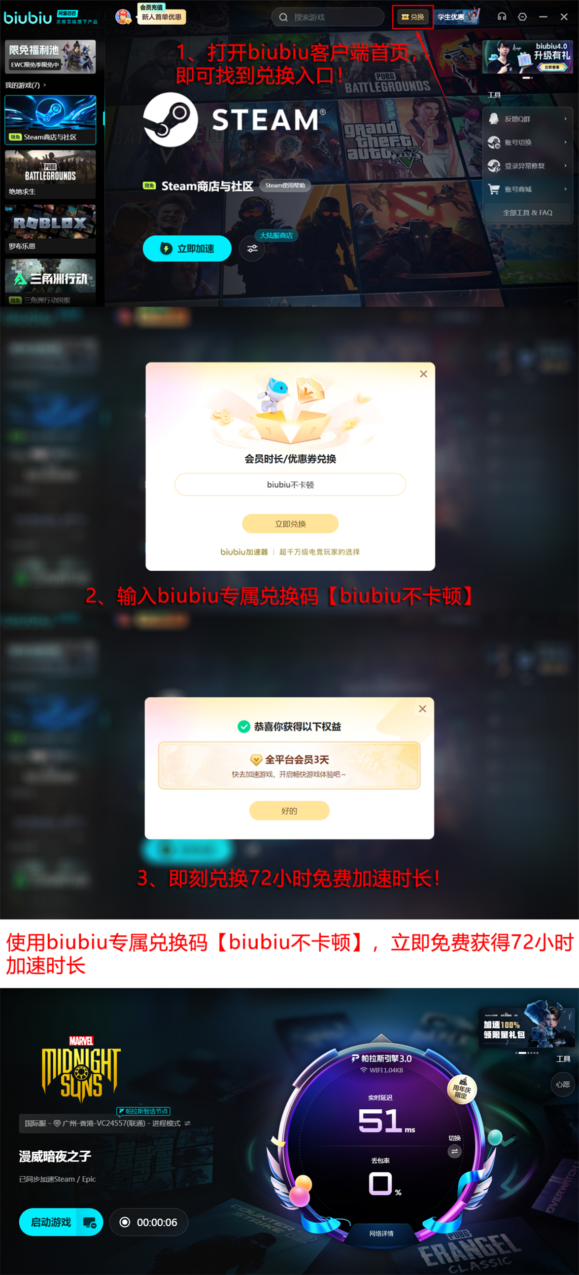 启动biubiu后,在搜索栏输入“漫威暗夜之子”,一键启用加速。引擎将自动匹配最优传输路径,并在运行中实时监测网络质量,遇节点波动或拥堵即刻无缝切换,从根源规避因通信中断引发的闪退。新用户注册后可享24小时全功能免费试用,该权益长期有效;另提供专属兑换码【biubiu不卡顿】,每位账号限领一次,可额外获得72小时加速服务,便于充分验证实际优化效果。