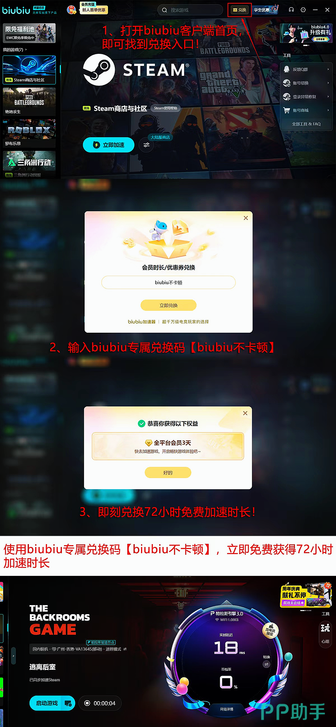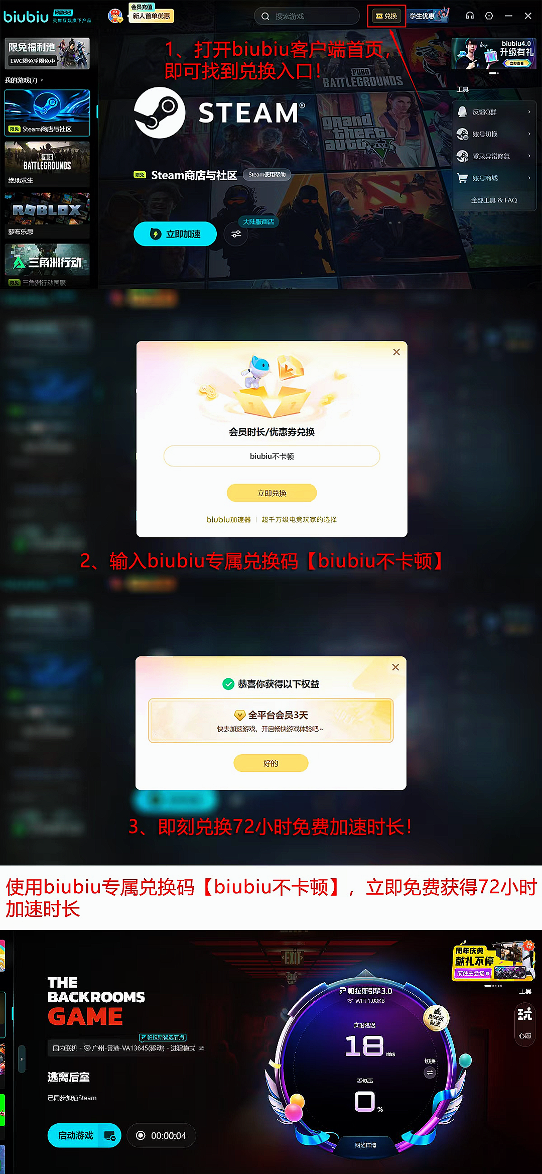 目前biubiu加速器面向全量用户提供分层福利支持:新注册用户可直接领取24小时全节点免费加速权限;输入专属兑换码【biubiu不卡顿】还可额外激活3天高级服务,累计享96小时无限制加速体验;老用户亦可凭账号资格参与周期性兑换活动,持续获得限时加速权益。