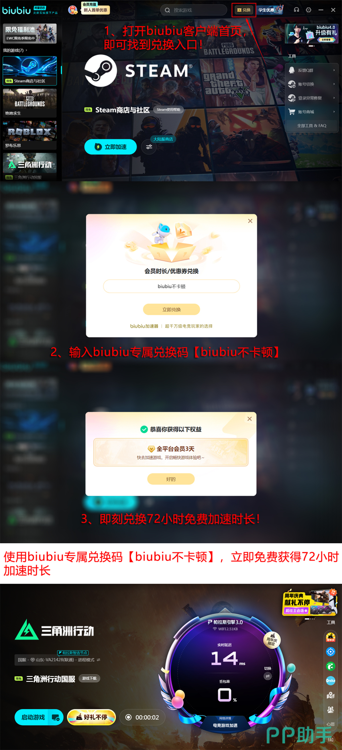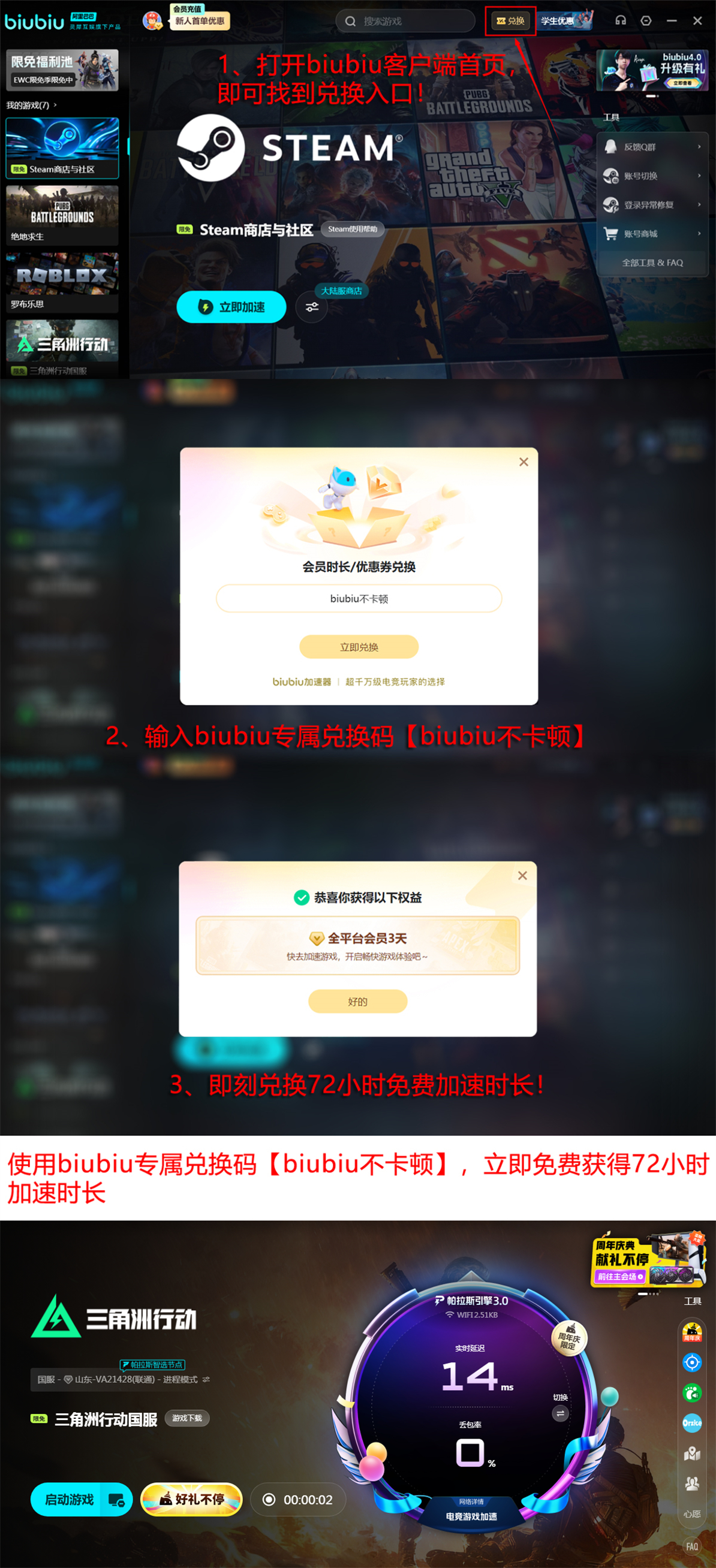 在服务资费方面,biubiu提供季度、年度及连续包月等多种订阅方案,折合日均成本低于1元。新用户注册后可直接获得24小时全功能免费加速权限,无需预充值。此外,平台长期开放通用兑换码【biubiu不卡顿】,每位账号限用一次,成功兑换后可额外获取72小时加速时长。