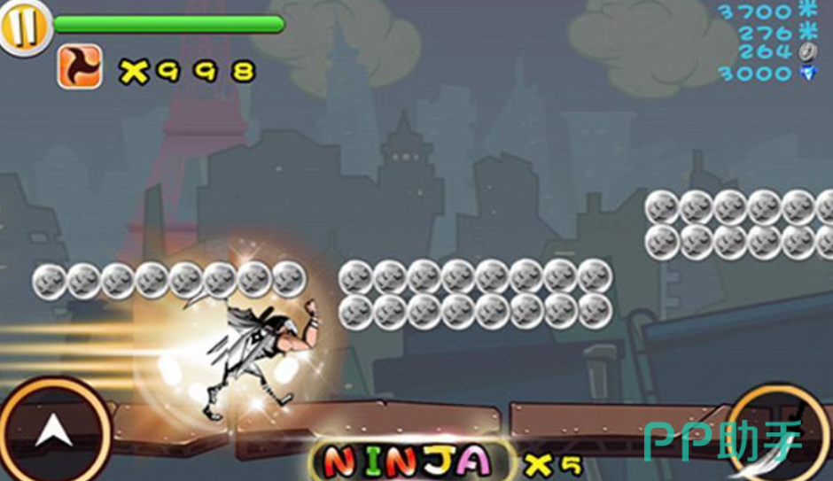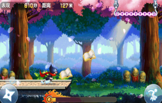 本作采用经典2D横版视角,引入三轨并行的跑酷路径设计,玩家可在不同轨道间自由切换以应对突发障碍或锁定目标。飞镖为默认主武器,支持蓄力投掷与连发模式,配合金币收集触发的能量加速机制,形成“闪避—蓄能—爆发”的循环节奏。支线任务嵌套于主线流程中,涵盖限时竞速、无伤通关与特定道具收集等多种类型。