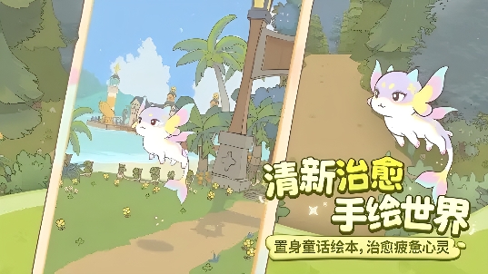 游戏整体采用细腻手绘风格,场景设计融合童话绘本语言:幻境森林的小径蜿蜒柔和,蔚蓝海岸铺满天然贝壳,嶙峋怪石错落分布的旷野亦充满叙事张力。每一帧画面均注重色彩温润度与视觉层次的平衡,线条灵动而不失稳重,动态插画感强烈,使静态界面呈现出呼吸般的鲜活节奏。