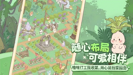 这种高度统一、富有温度的美术表达,与游戏“慢节奏治愈”的主题深度契合,营造出松弛、安心的交互氛围。每一次触控反馈都伴随柔和动效与恰到好处的音效,强化心理慰藉感。同时,游戏融合模拟经营与轻度冒险元素——玩家可自由采集资源、规划布局家园,建造功能型设施,持续产出食物、道具及捕获噜咪所需材料。