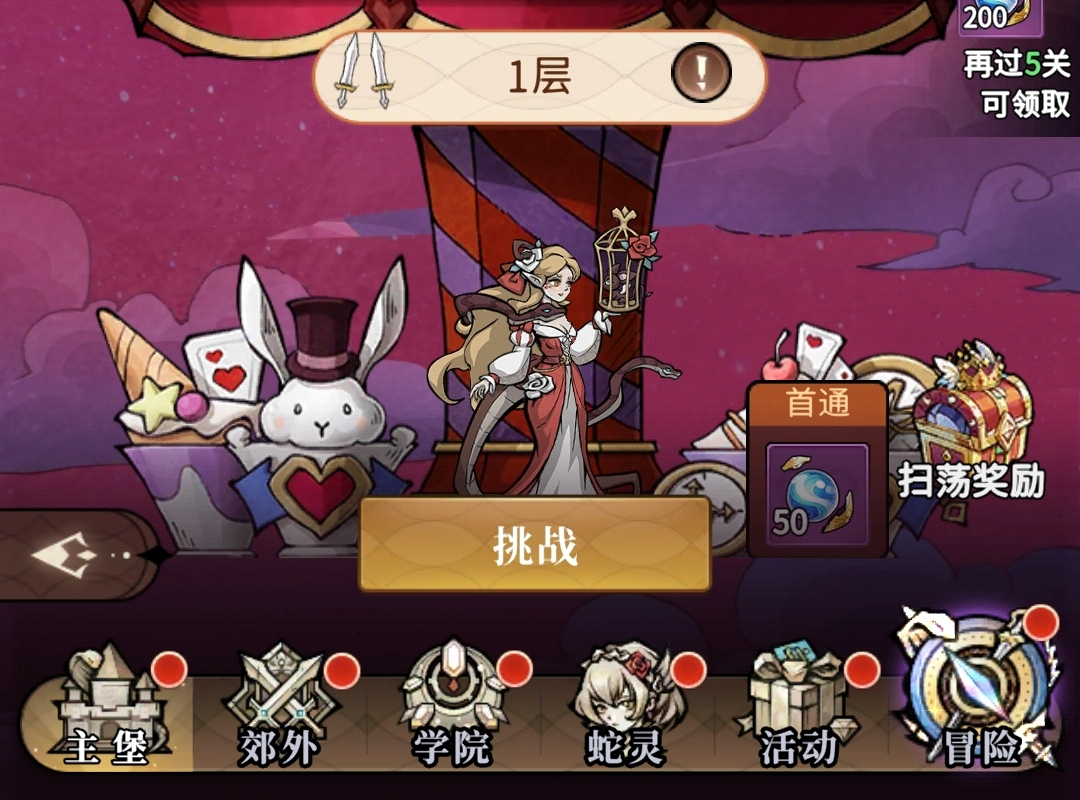 蛇塔:每次首通蛇塔都能拿到进阶晶球(蛇灵进阶道具),还能在完成指定层数的挑战后获得钻石、高阶装备等丰厚奖励,且当天通关的层数第二天就可扫荡领取金币和蛇灵经验,因此第一天需尽可能将层数推高,最好推到自己推不动后再停止。
