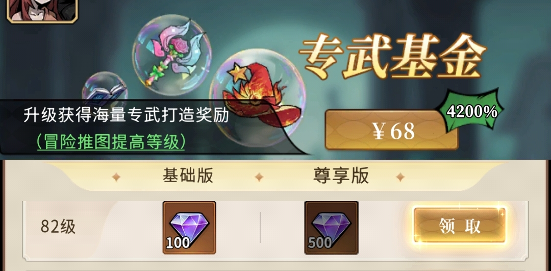 冒险特权:68元,购买后每天能获得进阶晶球、蛇灵经验等奖励,一次购买终身生效。