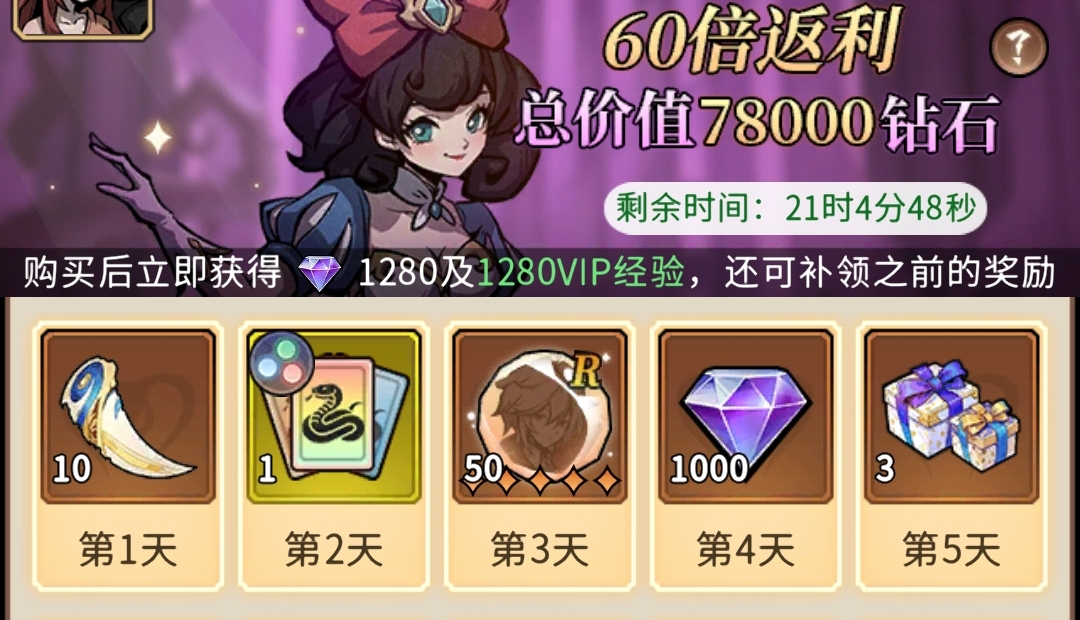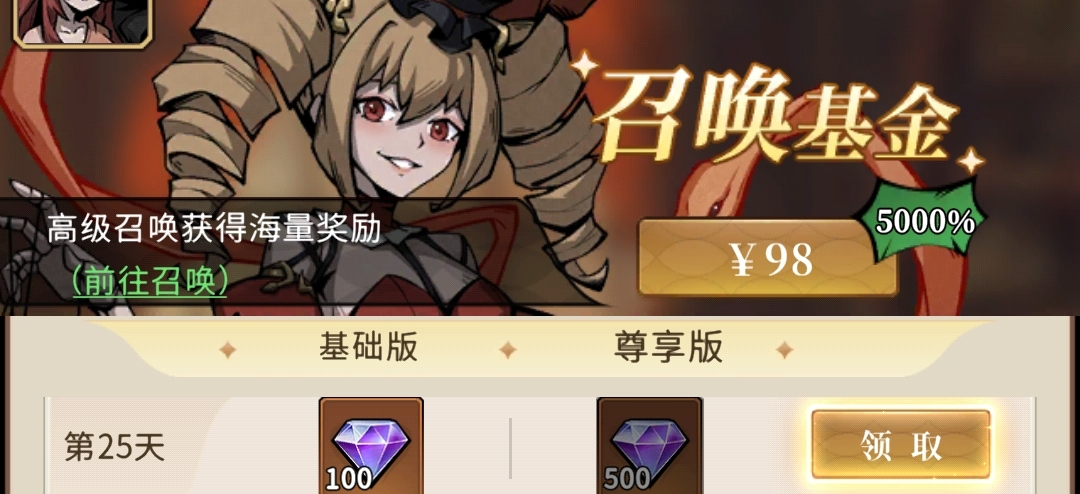 召唤基金:98元,累积在线达到目标天数后,就能领取大量钻石、蛇牙。