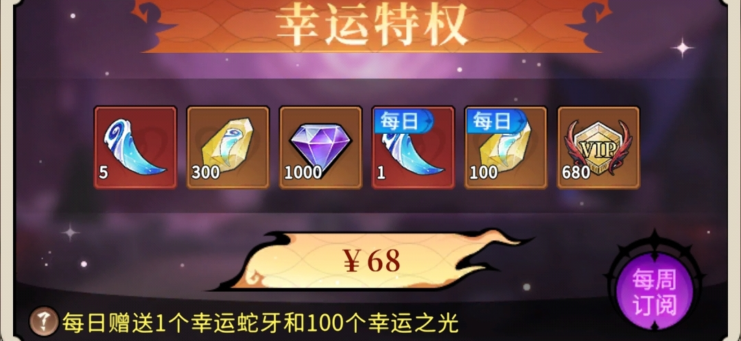 幸运特权:68元,每日能拿到1幸运蛇牙和100幸运之光(用于蛇灵转换),每次购买后特权效果持续7天。
