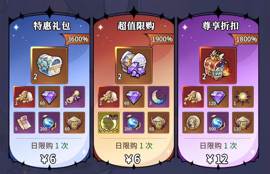 每日特惠礼包:共有6元礼包两种、12元礼包一种,每日重置可购买次数,能拿到大量稀有资源,性价比很高,推荐冲榜玩家和霸服大佬每天都买。