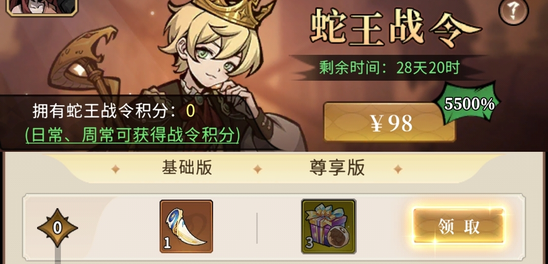 蛇王战令:98元,累积蛇王战令积分获取奖励,能拿到蛇牙、神话结晶自选箱、养成资源等奖励。