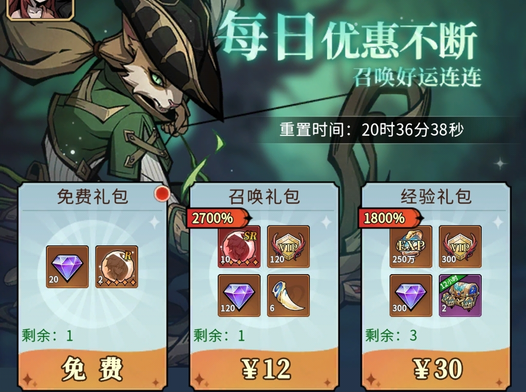 每日礼包:12元召唤礼包>30元进阶礼包=30元史诗结晶礼包>68元盲盒召唤礼包=68元特惠召唤礼包>其它礼包。