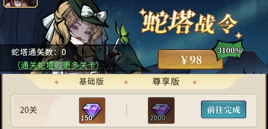 蛇塔战令:98元,在蛇塔里通关目标层数后可拿到钻石奖励,最高能获得31000钻。