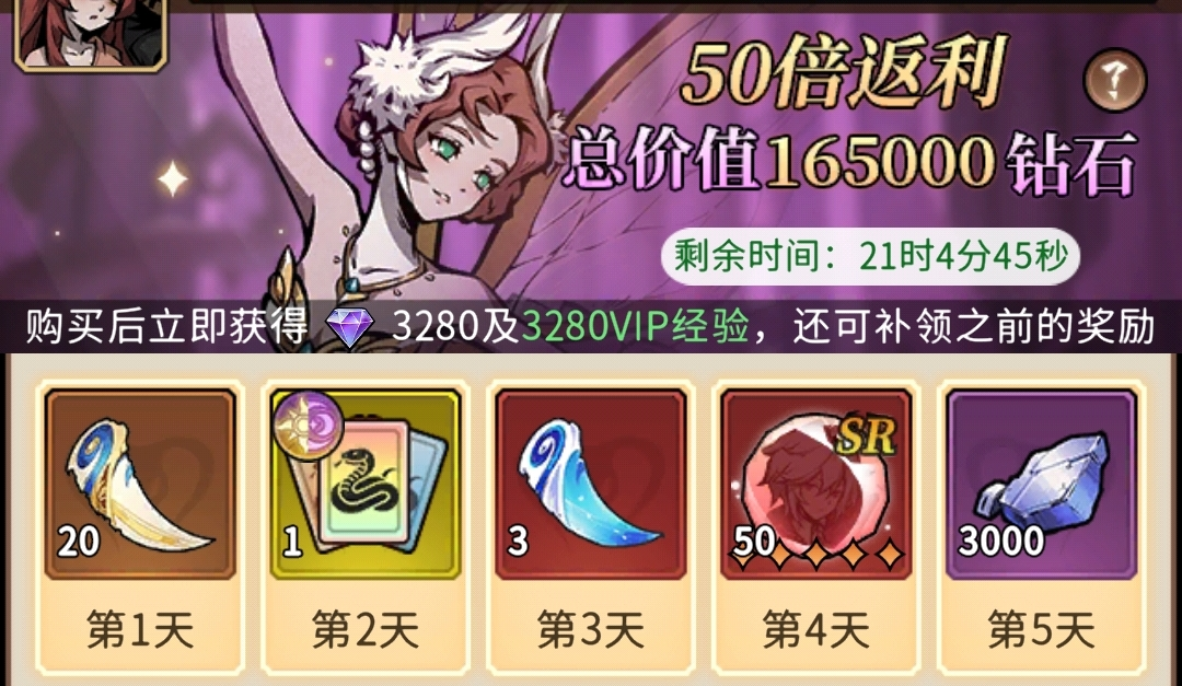 新服专享:分档买的专享折扣礼包,全部买完共需要花250元,能拿到大量的蛇牙(抽卡道具)、钻石、进阶晶球。