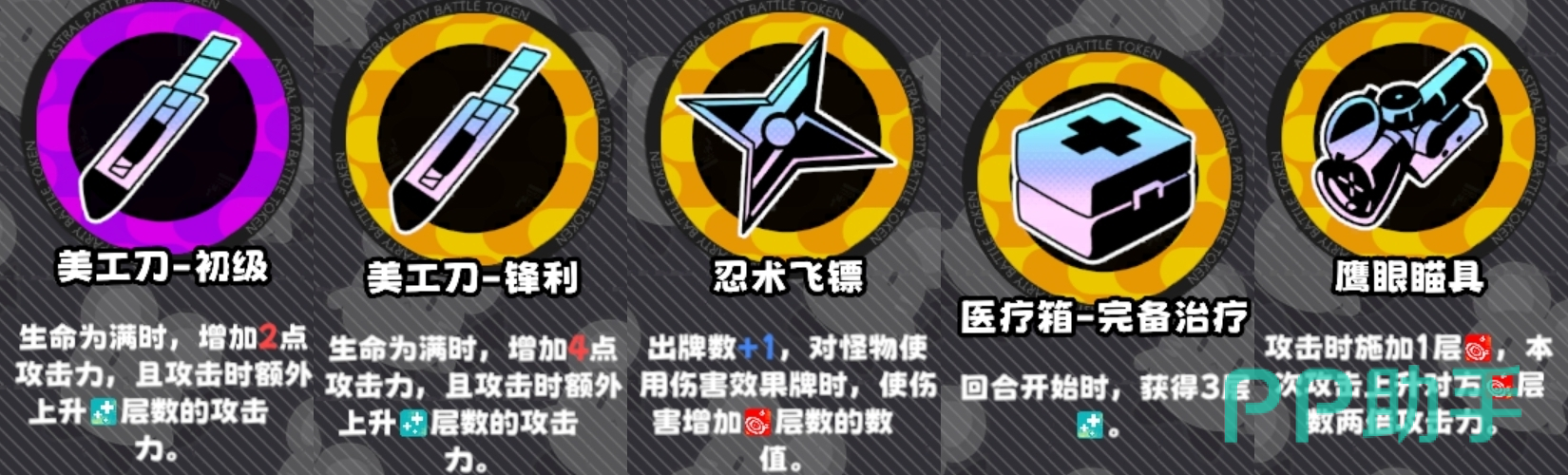 必拿筹码:鹰眼瞄具(核心)、忍术飞镖(核心)、美工刀—锋利(核心)、美工刀—初级、医疗箱—完备治疗。