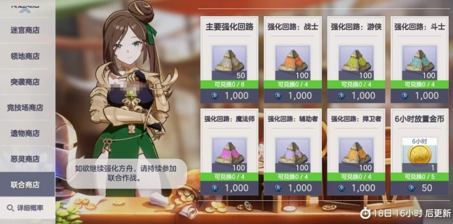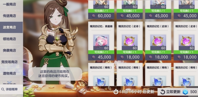 迷宫商店采用迷宫硬币结算,其核心策略为“定向优先、溢出补充”。指定史诗精灵记忆始终位列兑换清单首位,确保阵容短板精准补强;当目标达成后,剩余硬币可投入随机史诗精灵记忆池,扩大高价值单位获取概率;其余非核心道具因转化率偏低,建议直接跳过。领地商店产出的领地硬币总量充足,无需囤积。首推永恒花与高级抽奖扭蛋,二者分别强化角色基础属性与稀有单位获取能力;完成上述兑换后,再视需求补充领地建筑升级材料。