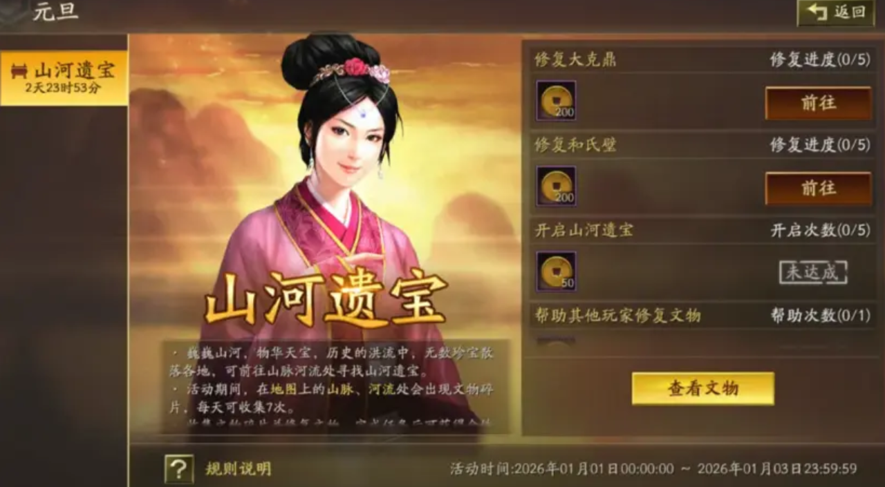2026.1.1至1.3会开启“山河遗宝”的活动,历史上势力值在300以上的玩家就可以进行参与,在这里收集文物碎片,并将文物给修复,每天0点会在地图的山脉和河流上随机刷遗宝,将其打开后就能直接拿到文物碎片,每天每人可以打开7次,到一定次数能拿奖励。