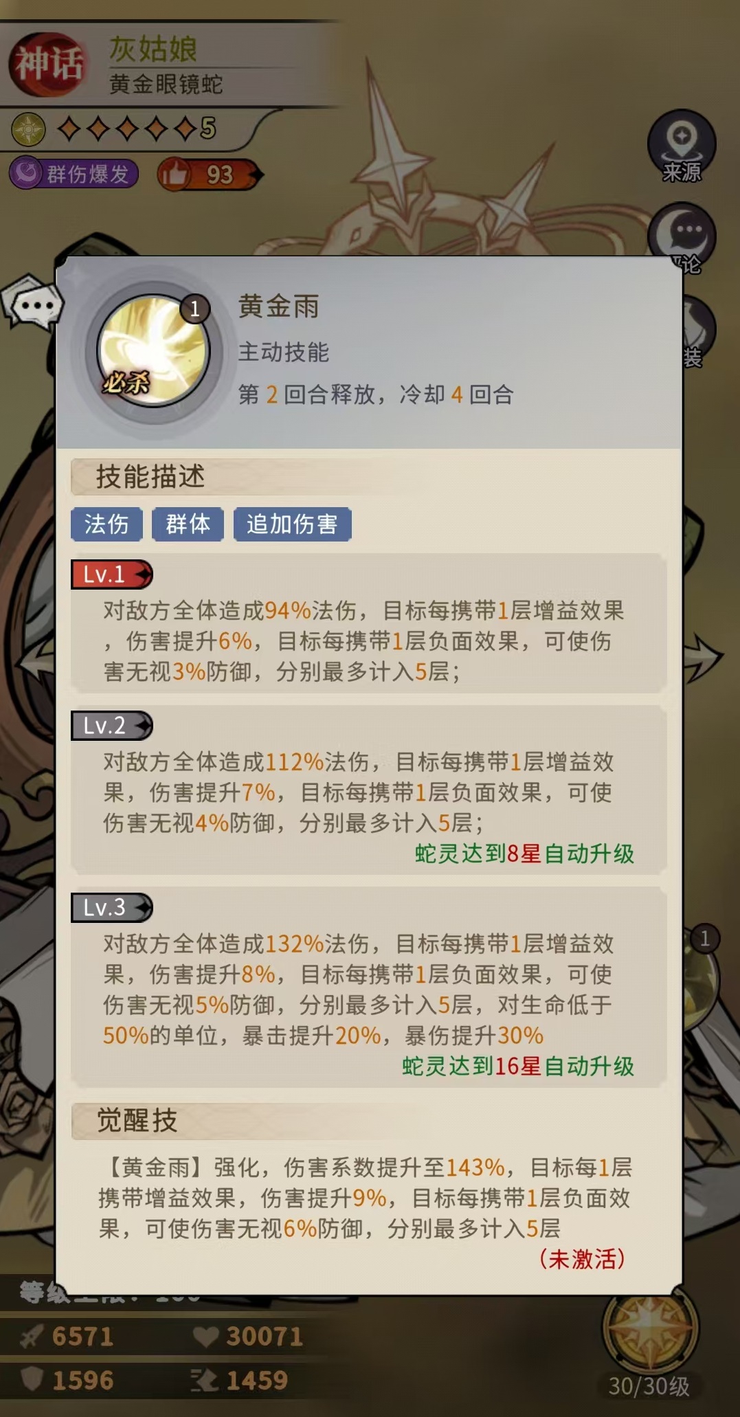 在游戏的定位中,灰姑娘是属于群伤爆发类型,她作为神话角色拥有两个主动技能和两个被动,在属性方面就要比其他的角色更强一些。先来简单看一下技能特点,主动技能星光璀璨,对敌方全体造成高额法伤,伤害由所有的目标共同承担,还有几率给目标附加日蚀效果。对方被影响后攻击和命中都会大幅度降低。觉醒之后该技能获得强化伤害系数提升,对攻击低于自身单位造成的伤害提升。第二个主动技能,继续对敌方全体造成法术伤害,目标身上携带的增益效果越多,伤害加成就越高,携带的负面效果越多无视防御百分比越高。