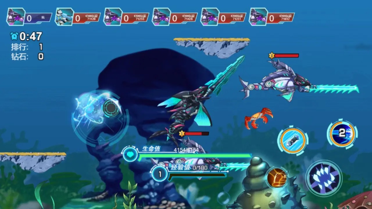 这是一款强调角色差异化选择的3D海洋生存进化手游。开局提供机械鲨鱼与八爪鱼两种初始生物:前者拥有高机动性与激光炮攻击能力;后者则依赖广域触手进行隐蔽伏击。玩家通过持续吞噬小型海洋生物获取经验值,自主分配技能点提升力量、速度、防御等基础属性。核心体验聚焦于PVP排位赛与高强度BOSS挑战,单人生存模式作为补充内容存在。