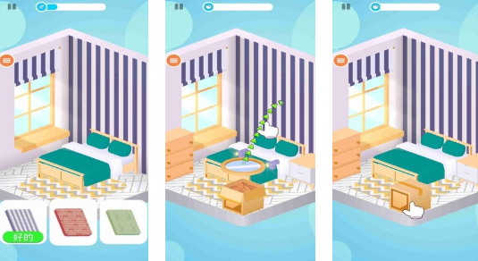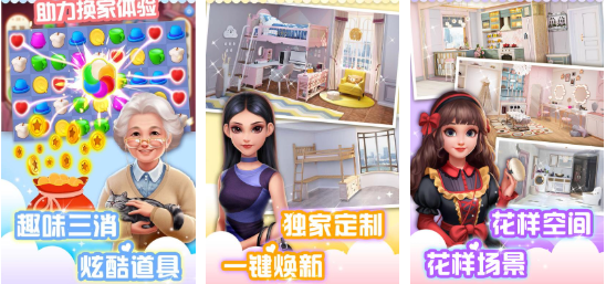 以经典三消玩法为底层驱动,通过累计星星资源解锁房屋功能分区,包括车库、厨房、门厅等核心生活模块。每个区域提供上千种装饰选项,覆盖墙纸纹理、地板材质、家具轮廓及配色方案,支持跨风格组合。内置拟人化NPC互动系统,如活泼小狗角色会实时提供布置建议,增强代入感与趣味性。