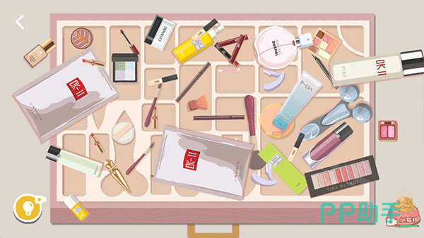 主打强视觉转化体验,初始场景呈现高密度杂乱状态——如散落台面的彩妆套组、倾倒橱柜的调味瓶阵列。玩家需逐层梳理优先级,依据功能分组(如护肤/彩妆/工具)、尺寸层级与视觉权重,重建整洁有序的功能区。部分高阶关卡设置超量堆积形态,要求预判最优路径与底层支撑结构。