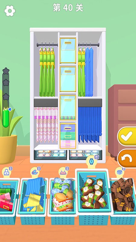 专注服饰类物品精细化管理,涵盖鞋履、手袋、上衣、配饰等十余种品类,每类均具备差异化三维模型——包括不规则褶皱、柔性材质形变与镂空结构细节。玩家需依分类逻辑、色系分布及取用频率,在多层立体衣柜中完成动态归位,成功通关即触发“空间解谜”成就反馈。