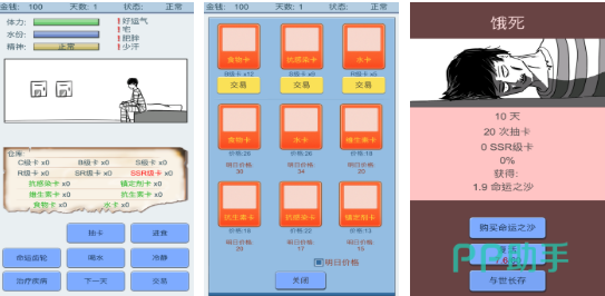 深度模拟手游抽卡生态的模拟经营类作品。生存资源全部依赖随机抽取机制获取:食物卡、治疗卡、状态变更卡均通过卡池概率发放。玩家角色属性随欧气/非气波动实时变化,健康值可能因十连未出SSR骤降,也可能因单抽闪金瞬间回满。每一次抽取都伴随明确数值反馈与心理预期落差,还原真实抽卡行为的情绪曲线。