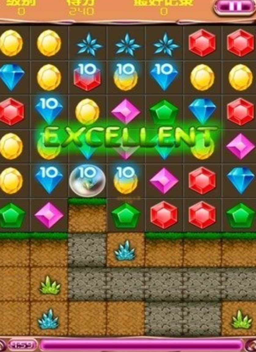 区别于常规网格消除,《宝石猫》引入“地质勘探”概念。在采矿模式中,部分宝石被土壤层覆盖,仅露出局部轮廓。玩家需优先消除邻近土壤的可见宝石,利用消除产生的物理冲击波震裂土层,从而揭示掩埋的未知宝石。该机制强化了空间预判与风险评估,使每一次操作都兼具探索性与策略纵深。