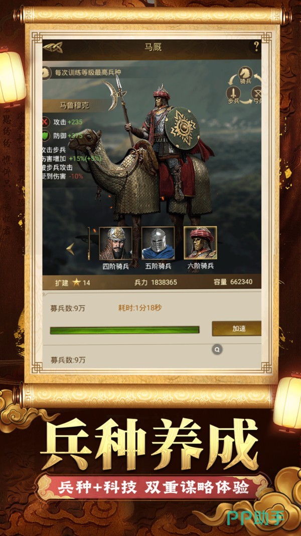 每场战役均支持自由部署与临场战术变更,地图内设有矿脉、粮仓、要塞等战略资源点,触发围点打援、奇袭补给、据险固守等多样化作战模式;全游戏共设计12类基础兵种,每类具备3阶进阶路径及2项专属战技,例如重骑兵可激活“践踏冲锋”与“破甲突刺”,弓箭手可习得“散射压制”与“燃烧箭雨”。
