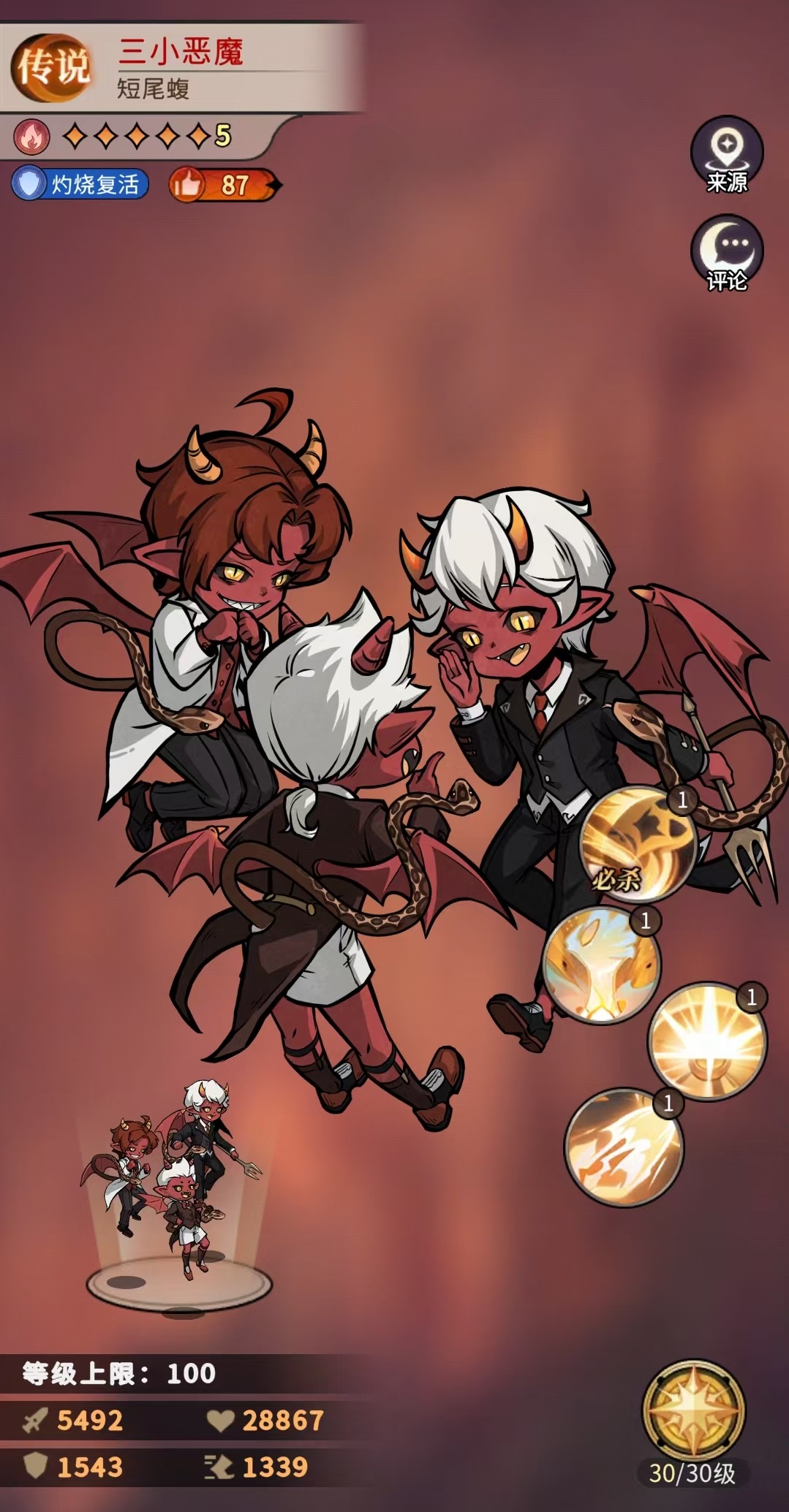 三小恶魔是属于传说品质的守卫职业,他的血量多防御高,自身还带有独特的复活机制,是很好用的坦克,不仅仅是前期能够使用,用到中后期也没有任何问题。他的主动技能除了造成物理伤害外,还有几率附加灼烧以及烈焰灼烧,这两个效果都可以使目标损失生命值。其他三个是被动效果,第一个是在战斗中首次阵亡时将获得重生,也就是多了一条命,所以这一点是和其他坦克不同的地方。另外被动可以提升生命和攻击,以及在受到攻击时有几率对攻击者施加灼烧。