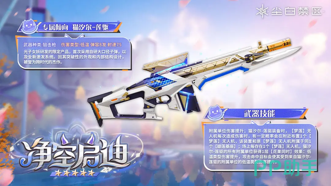 先看武器“净空启迪“,专属倾向”猫汐尔-莲驱“,这是一把狙击枪,武器技能使附属单位伤害提高,该武器装备时,”梦莲“无人机每次造成伤害时,有一定概率会在附近布置一个”梦莲“无人机,场上每拥有1个无人机,该武器所有附属单位获得1层”花果同时“效果;