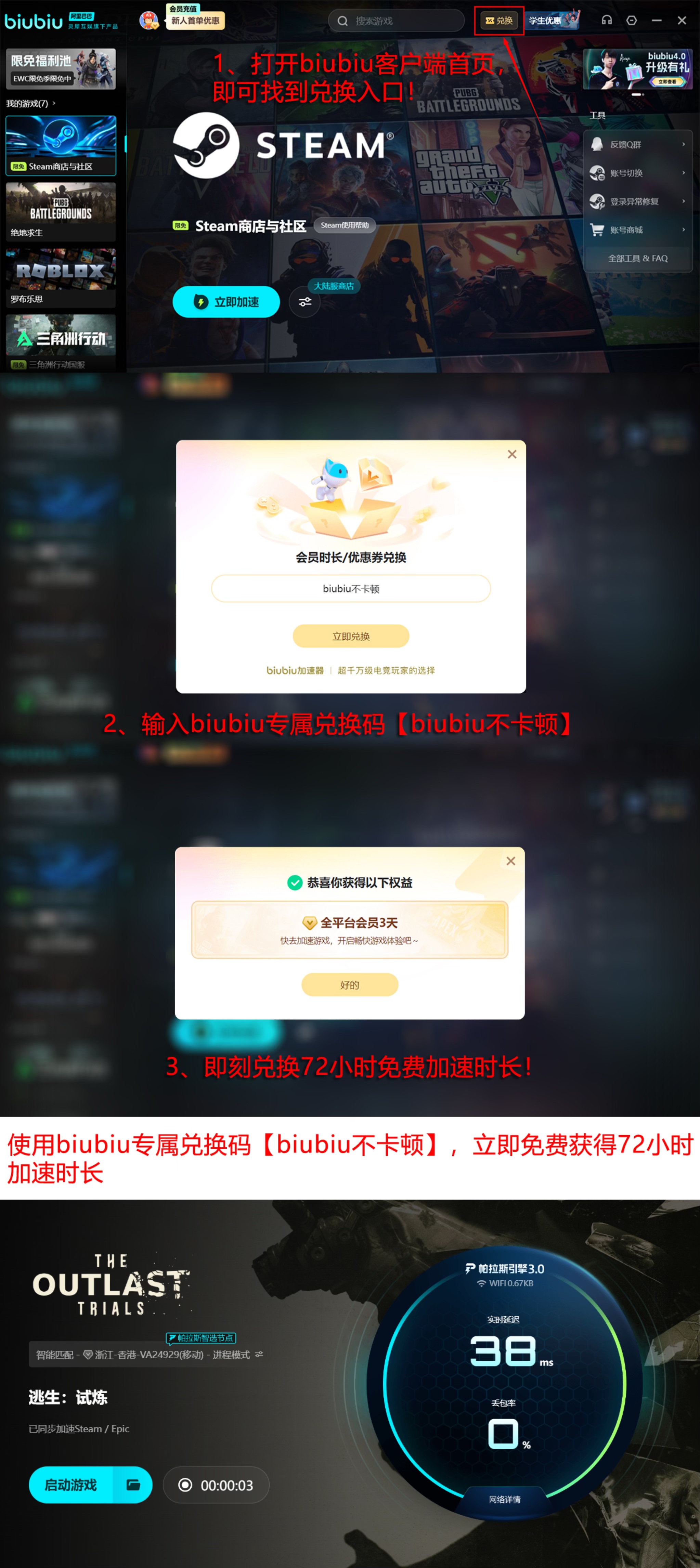 biubiu加速器提供面向新用户的专项体验权益:完成首次注册并登录后,系统将自动发放24小时全功能加速时长;所有已注册用户(含老账号)均可通过加速器首页输入口令“biubiu不卡顿”,兑换一次为期3天的高级会员加速权限。该权益覆盖完整游戏流程所需时间,足以支撑玩家从新手教学至高难度关卡通关的全程稳定连接需求。