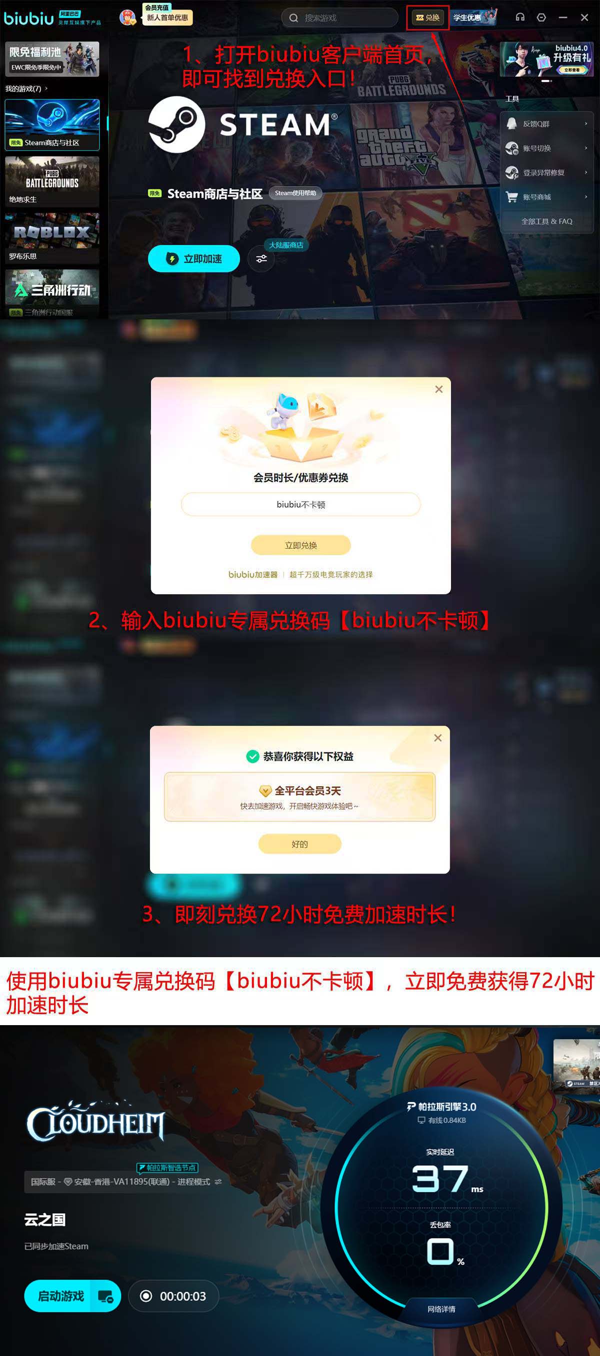 针对《云之国》强调毫秒级技能释放与实时动作判定的特性,biubiu加速器提供全链路低延迟保障,从设备入网、协议握手、数据加密到服务器响应,全程优化关键路径。新用户完成安装并注册后,系统自动发放24小时免费加速时长;进入首页点击“兑换”,输入口令【biubiu不卡顿】,即可额外领取72小时,累计享96小时无门槛体验。
