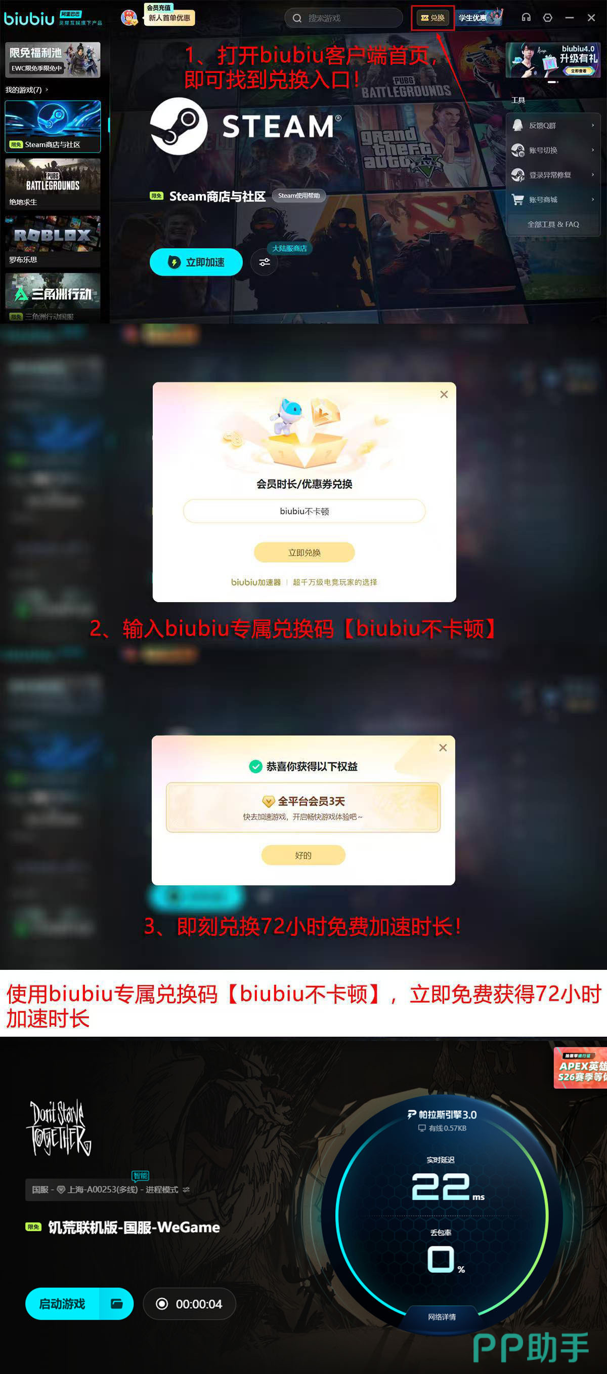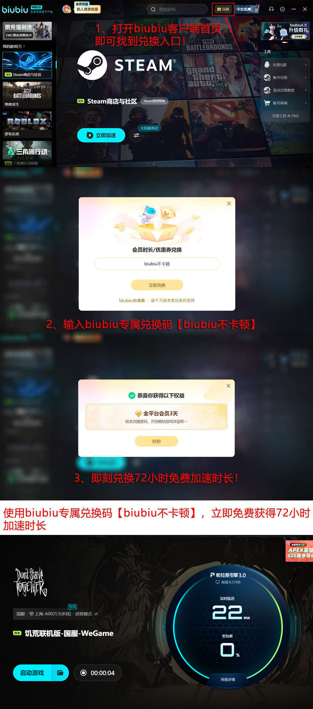启用biubiu加速器后,《饥荒》联机平均延迟下降约40%,丢包率趋近于0,角色动作响应速度明显加快,世界同步稳定性大幅提升。新用户注册即可获得基础加速权益:完成账号激活后系统自动发放24小时免费时长;随后进入客户端首页“兑换”入口,输入专属口令【biubiu不卡顿】,额外领取72小时加速权限,总计可享96小时无限制体验。